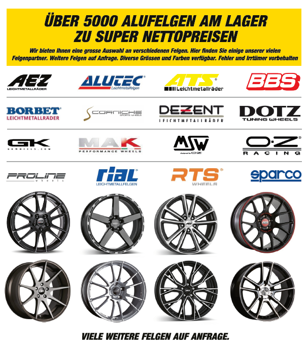 Wir führen eine sehr grosse Auswahl an Felgen von diversen namhaften Herstellern. Eine Übersicht finden Sie in der Unterkategorie "Felgenprogramm"